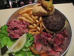Finally a new restaurant on the block in Sinalunga where the New York look is at the rendez-vous! La Toraia, which means “bull stable” offers an innovative menu in a Tuscany where Artusi is still venerated. Arrivederci cucina tipica Toscana; buongiorno to a new way to serve the famous Chianina meat, so precious to this region. In fact La Toraia is a 19th century bull stable at Tenuta La Fratta which was turned into a very elegant restaurant, though preserving the original architectural elements. La Toraia is indeed a great place to live a food experience. On the menu, a hamburger – yes, but a unique one! The owners Enrico Lagorio and his wife Antonella said it was about time that a good chianina meat hamburger was served in the Val di Chiania region. A hamburger made with the best chianina mixed with pork fat that gives it a unique flavour. The tartar from our menu degustazione (bottom photo) was “earthy” and delicately tasty; the roast beef, served blue and thin sliced, was impeccable!