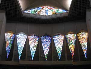 Maria Reina is indeed beautiful. Vast and well lit with huge and wonderful stain glasses (by Mario de Ayala), it can accommodate very large crowds in an oval space. The sculpture of Christ in the apse, Christ as the Liberator of Latin America (R. A. Betancourt) is just stunning. Scarcity can be noticed in the high reliefs of the apse since they are made in plaster from a dozen of moulds; but they are beautiful.  The vault (my photograph) resting on the four walls and the clerestory opening to the outside open space, recall the construction of the past Gothic.