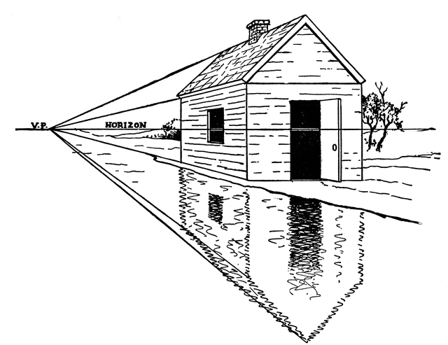 At that very moment, when facing that view-point, you are always truly facing it. If you draw a vertical line down from the view-point, this is your trajectory; this is where you are going be in the near future or a more distant future. In this case, if you draw a vertical line from the view-point (V.P.) your trajectory will be on the left of this small house, why you see its left side.
