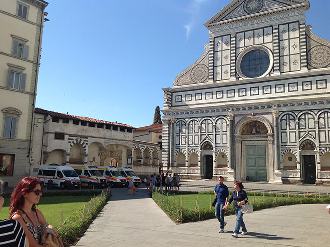 In the 19th century, doing the Grand Tour of Europe, many British women (and few men) would faint in the Tribuna of the Uffizi or on Piazza della Signoria in Florence, in front of its loggia filled with statues from the Renaissance and the Antiquity. For them, it was too much, too many beautiful things to be cognitively absorbed at once. But in fact, it was their long thick Victorian black dresses worn in temperatures above 30 degrees (Celcius) that made them faint. Since we asked our participants to wear light comfortable cloth and we made sure that they were always hydrated, the ambulance remained well parked in front of Santa Maria Novella.